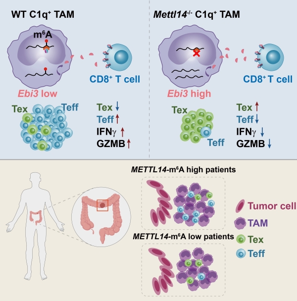 肿瘤相关巨噬细胞m6A修饰酶Mettl14的降低将上调Ebi3 mRNA的稳定性,提高EBI3的分泌释放并进一步致使CD8+ T cells的功能失调,最终促进肿瘤生长