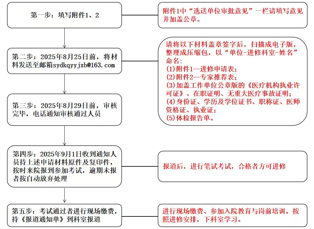 1.我院将对申请表进行审核,审核通过后将会以电话的形式进行通知,请保持电话畅通。接到通知的人员,请携带相关申请材料,按指定时间来院报到参加考试,合格者方可进修。