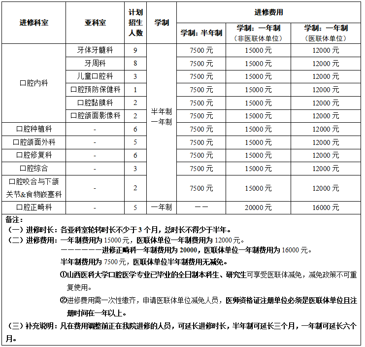 为积极响应《健康口腔行动方案》中“加强基层人才队伍建设”要求,支持口腔医学从业人员持续学习与能力升级,切实履行社会责任。同时,得益于我院东院区扩建、椅位增加,能更好地容纳优秀医师来我院学习,现行新版进修医师收费标准。旨在让更广泛的医生,特别是来自基层医院的优秀人才,减轻经济负担,获得进修深造机会。调整后的招生计划如下表: