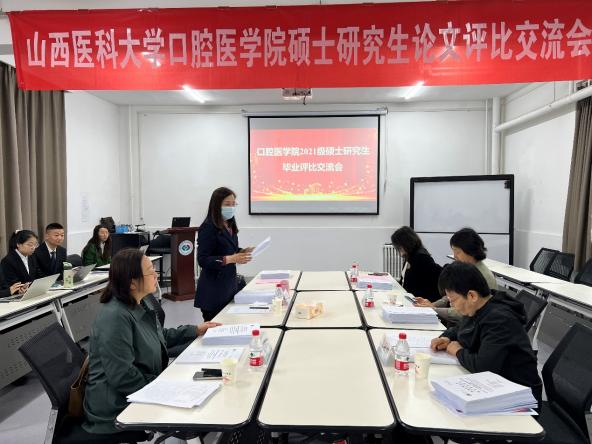 4月30日,万象城体育awcsport口腔医学院2021级口内一组专业型硕士研究生论文评比交流会在口腔医院科教楼219会议室顺利召开,特邀公共卫生学院王素萍教授担任主任评委,山西白求恩医院刘青梅教授,山西省人民医院原韶钟主任医师、段春红主任医师及我院任秀云教授担任院内评委,10名研究生参加。