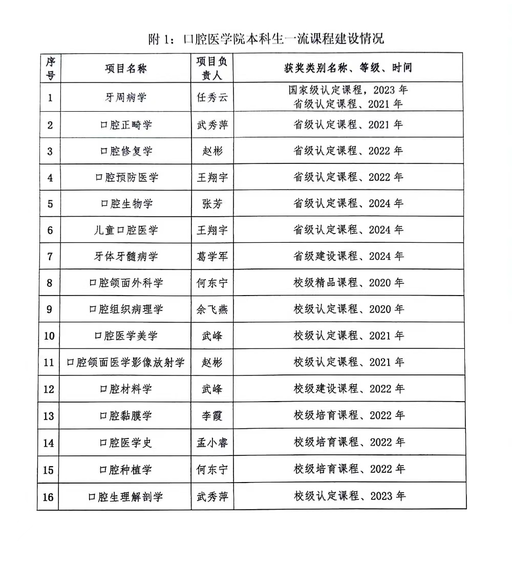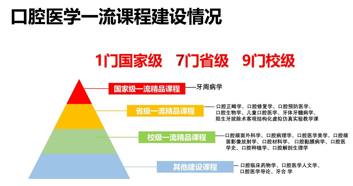 我院始终深入贯彻落实《教育部关于一流本科课程建设的实施意见》,不断加强一流课程建设培训辅导,力推线上线下混合式教学改革,积极促进信息技术与教育教学的深度融合,全面提高教育教学质量。在全院教师不懈努力下,逐步形成了1门国家级一流课程领衔,7门省级一流课程助力,9门校级一流课程建设支撑,全面覆盖口腔医学主干课程的全精品课程体系。目前《口腔修复学》《口腔正畸学》正在冲击国家级一流课程。