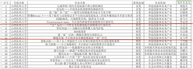在第十四届“挑战杯”山西省大学生创业计划竞赛决赛中,由李冰教授等指导,李永智同学负责的作品《fluorescence-nano,开启恶性肿瘤骨转移精准诊疗新时代》获省级金奖;由刘君瑜副教授、王翔宇教授等指导,史玉坤同学负责的作品《糖敏齿凝——开启纳米级血糖超敏凝胶“颌”时代》获省级铜奖。