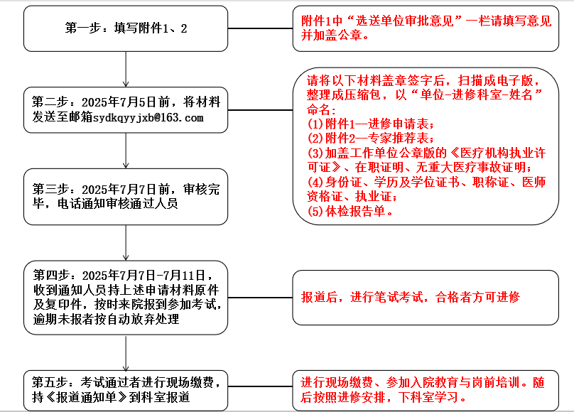 1.我院将对申请表进行审核,审核通过后将会以电话的形式进行通知,请保持电话畅通。接到通知的人员,请携带相关申请材料,按指定时间来院报到参加考试,合格者方可进修。