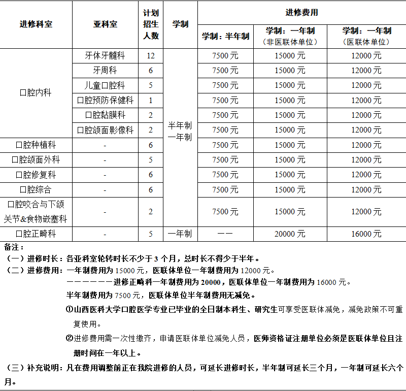 为积极响应《健康口腔行动方案》中“加强基层人才队伍建设”要求,支持口腔医学从业人员持续学习与能力升级,切实履行社会责任。同时,得益于我院东院区扩建、椅位增加,能更好地容纳优秀医师来我院学习,现行新版进修医师收费标准。旨在让更广泛的医生,特别是来自基层医院的优秀人才,减轻经济负担,获得进修深造机会。调整后的招生计划如下表: