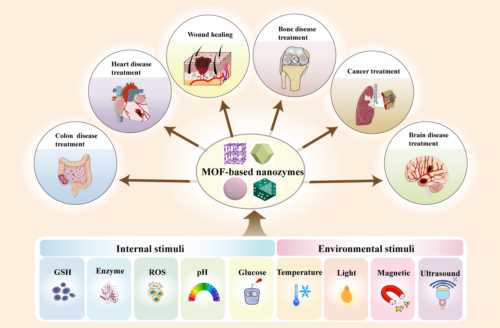 纳米酶是一种具有仿酶活性的纳米材料,因其稳定性、可调性和成本效益而在生物医学领域备受关注。其中,基于金属有机框架(Metal-Organic Framework,MOF)的纳米酶因其独特的结构和可定制的特性脱颖而出。文章首先全面介绍了基于MOF的纳米酶的分类,这些纳米酶旨在模仿氧化酶、过氧化物酶、过氧化氢酶、超氧化物歧化酶、水解酶和多功能酶的催化功能,深入研究了基于MOF的纳米酶对特定刺激的反应,以确保在环境变化中提高催化性能的特异性和有效性。此外,该论文还介绍了MOF基纳米酶在癌症治疗、组织再生等生物医学方面取得的研究进展,并深入探讨了该前沿领域的未来机遇和挑战。这些基于刺激响应MOF的纳米酶为先进的治疗策略提供了新的途径,为创新的生物医学应用提供了前景。