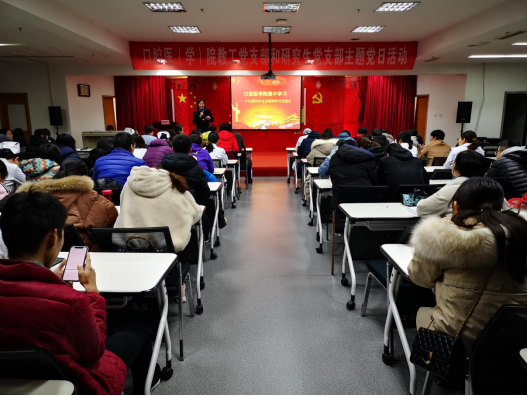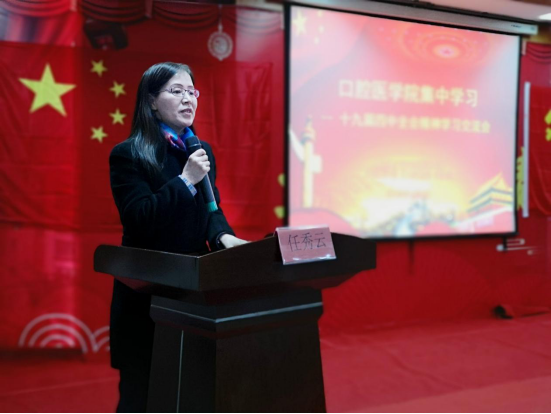 11月29日下午,口腔医学院在八层学术报告厅召开了党支部主题党日活动--集中学习党的十九届四中全会精神,全体教工党员、研究生党员、中层干部100余人参加。本次活动由我院党委书记任秀云主持。