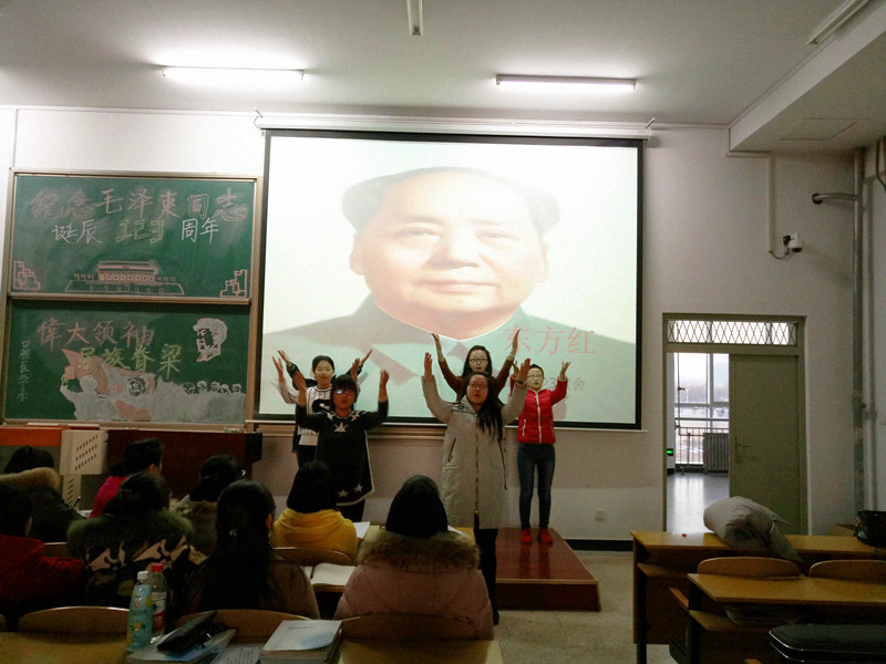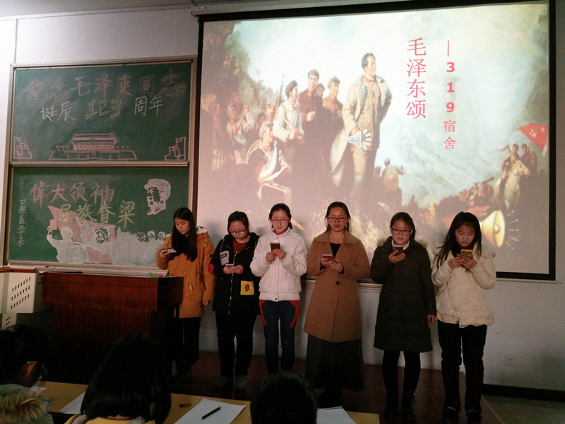 为深切缅怀毛泽东同志丰功伟绩,激发广大学生的爱国热情和爱校热情,营造和谐的校园文化氛围,由口腔医学系党总支发起的“纪念毛主席诞辰123周年文艺活动”于12月27日下午在新校区至真楼301教室举行。口腔医学系党总支副书记殷凤、思想政治辅导员王燕、王丙娜以及口腔医学系新校区全体学生参加了此次活动。