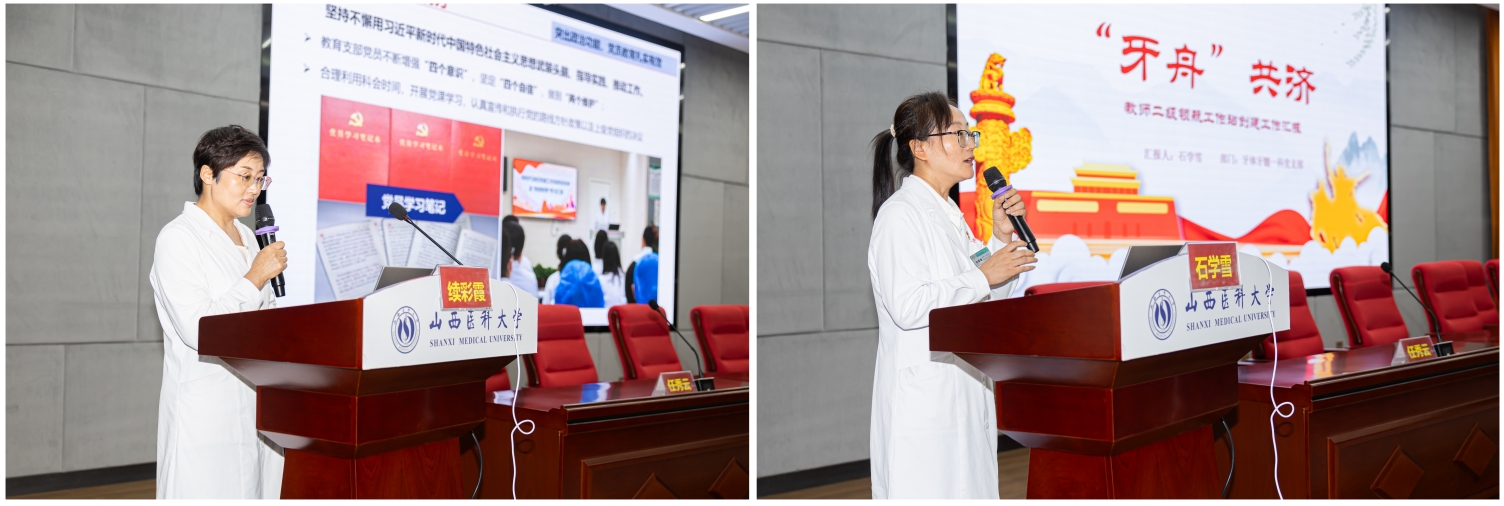 优秀共产党员代表、口外科党支部书记程永峰和优秀党务工作者代表、后勤党支部书记王晓静作了交流发言;先进基层党支部代表、口腔全科党支部和牙体牙髓一科党支部分别就各自支部的党建品牌创建工作进行了精彩分享。