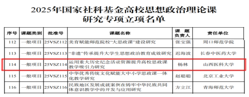 近日,全国哲学社会科学工作办公室正式公布了2025年国家社科基金高校思想政治理论课研究专项立项名单。我院杨林老师申报的课题《运用重大历史纪念活动资源提升高校思政课教学吸引力研究》喜获立项。