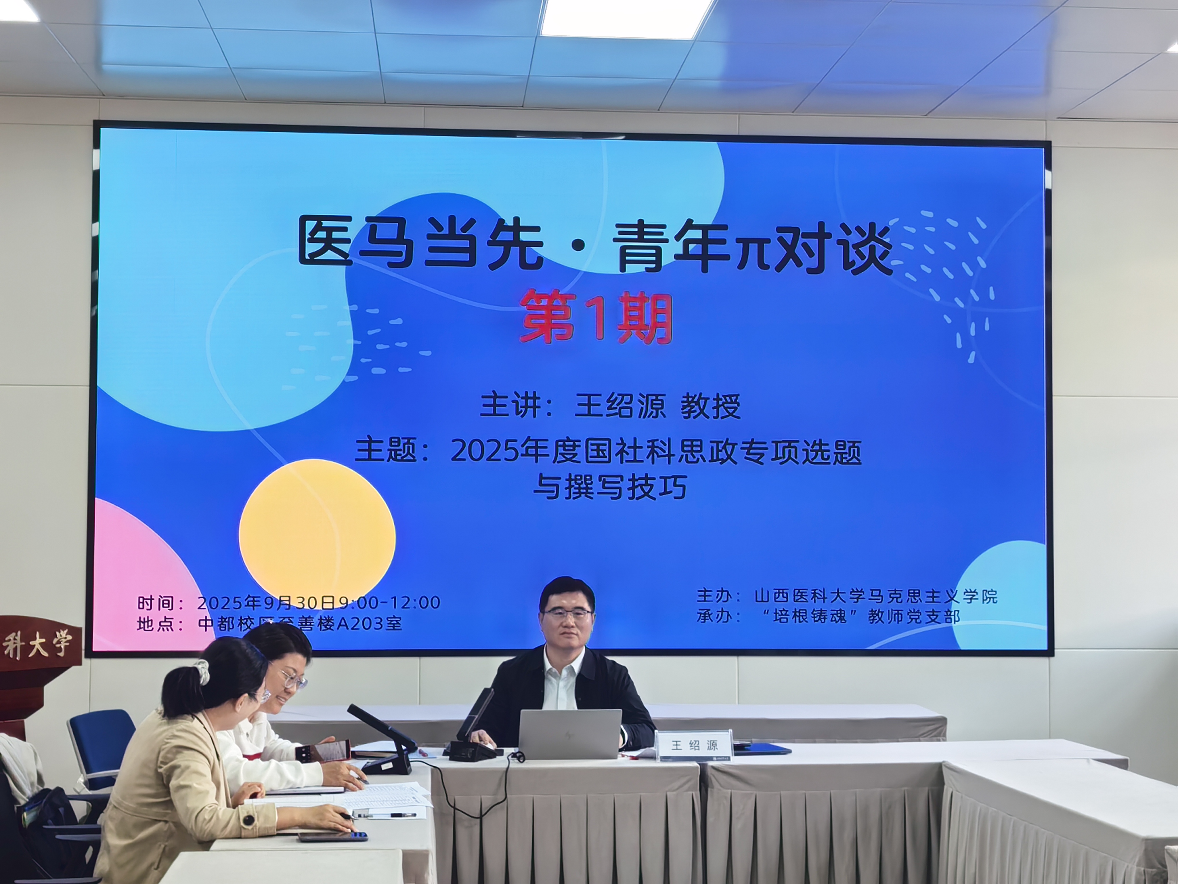 9月30日上午,马克思主义学院“培根铸魂”教师党支部在至善楼A203室开展了“医马当先 青年π对谈 第1期”活动。本次活动由支部书记杨烨阳副教授主持,特邀王绍源教授围绕“2025年国社科思政专项选题与申报技巧”进行专题分享,支部党员教师和研究生代表30余人参加了此次对谈。