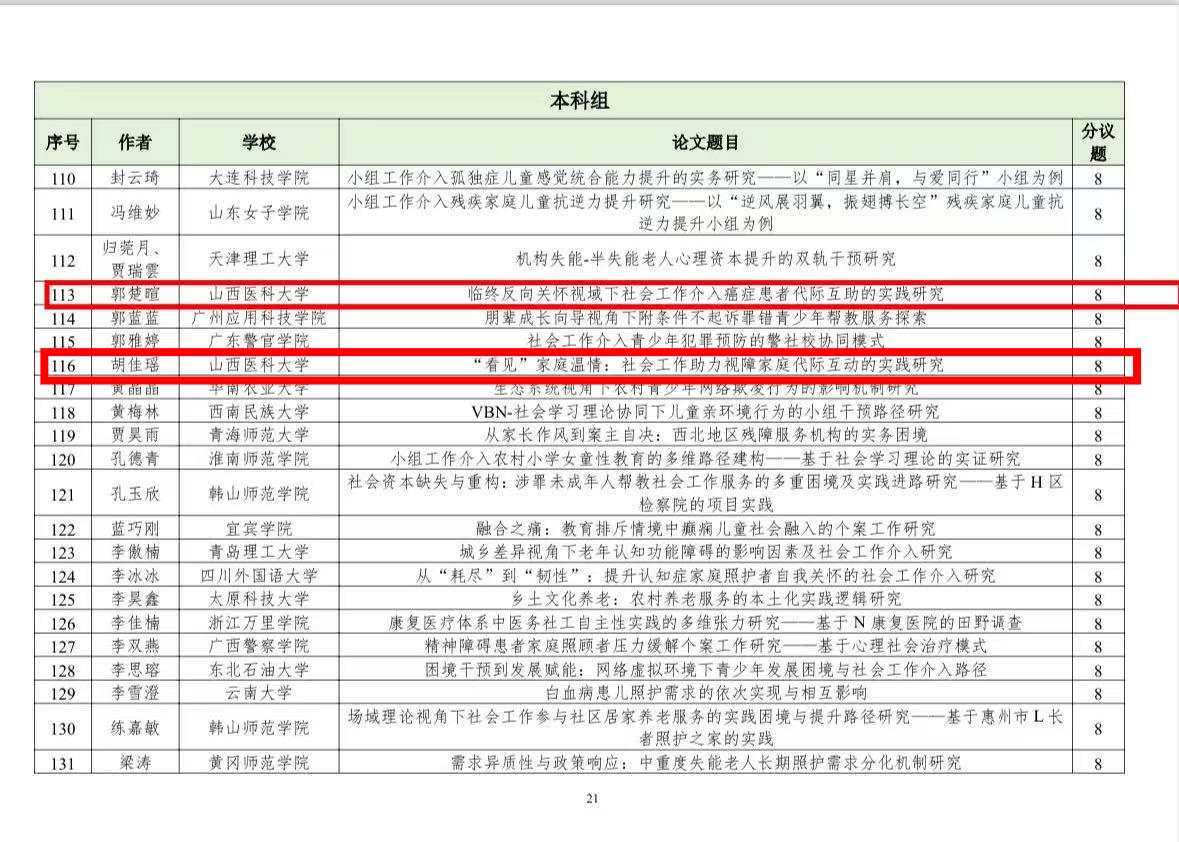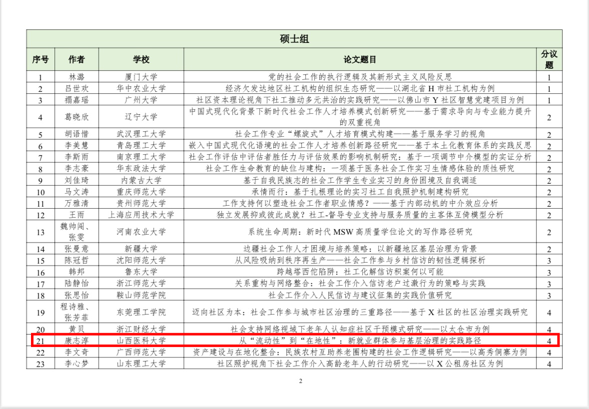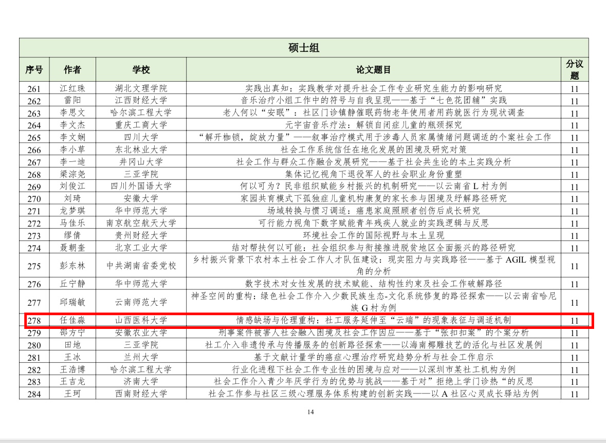 近日,中国社会工作教育协会发布了“第十七届中国社会工作大学生论坛暨第十届社会工作研究生论坛”入选通知及名单。自征文通知发布以来,协会共收到稿件(摘要)831篇,经专家初评,最终549篇入选。我院学子积极参与,表现优异,共有3名硕士研究生、3名本科生的论文成功入选。
