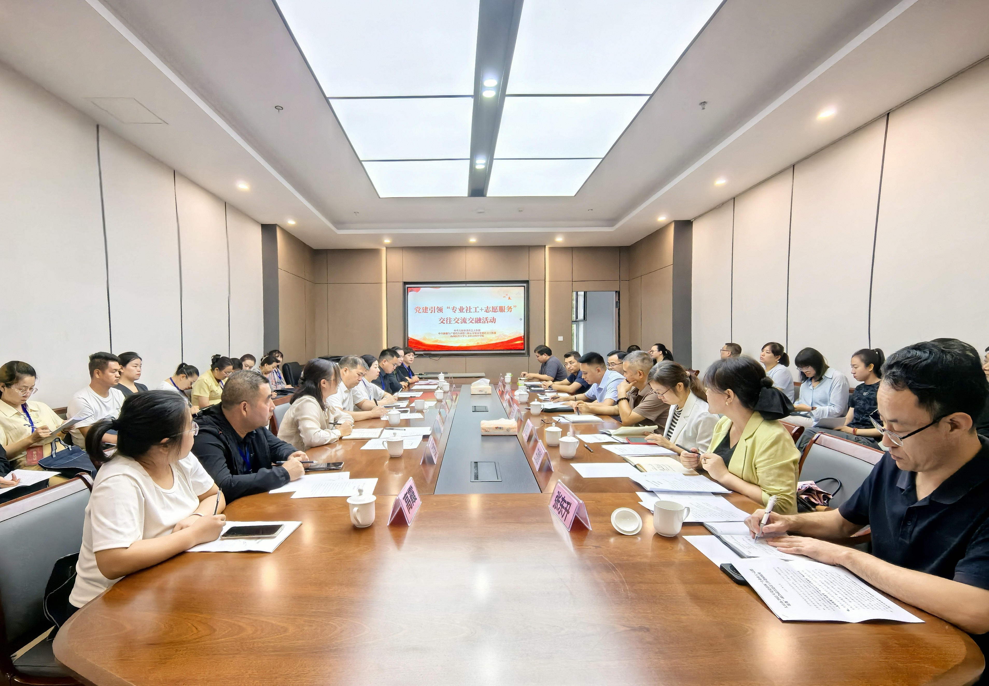 座谈会上,姚尚满对赵爱兵一行表示欢迎。他围绕社会工作专业人才培养、科学研究、社会服务等进行了介绍,明确提出希望与五家渠市、太原市深化工作对接,以务实合作推动社会工作高质量发展。赵爱兵感谢万象城实训中心前期对五家渠市社会工作人才培育和公益组织孵化方面的大力支援,结合实际介绍了边疆多民族地区社会工作的实践情况。张郭平感谢万象城在社会工作经验推广中的桥梁作用,阐述了太原市在党建引领下“专业社工+志愿服务”的试点经验。王志中指出,当前行业需加快推进职业化进程,进一步深化跨区域协作的广度与深度。