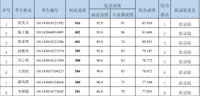 第一志愿招收攻读硕士学位研究生部分专业拟录取名单