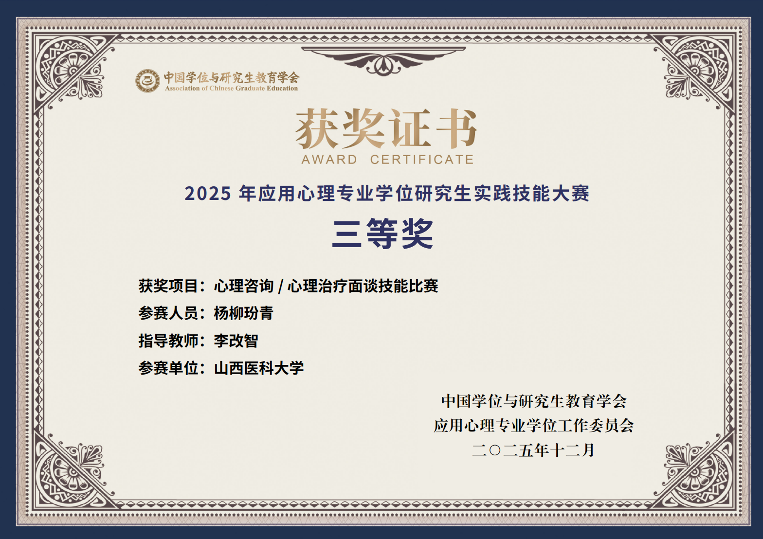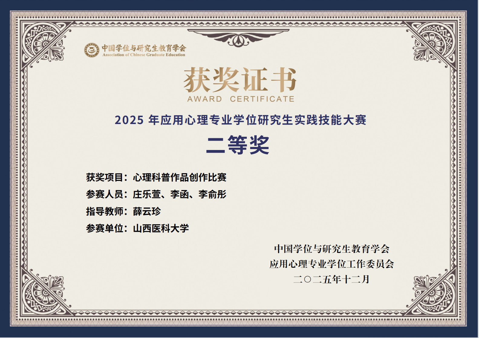 经选拔,万象城人文社会科学学院应用心理专业研究生在本届大赛中荣获全国二等奖1项、三等奖2项。其中,心理科普作品创作赛道获全国二等奖;应用心理方案/产品设计赛道与心理咨询面谈技能赛道各获全国三等奖1项。