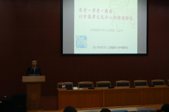 首先,由王志中教授作了题为“养老·孝老·敬老:以中国孝文化介入积极老龄化”的主题讲座。王教授从党的十九届五中全会明确提出“实施积极应对人口老龄化国家战略”和《中华人民共和国国民经济和社会发展第十四个五年规划和2035年远景目标纲要》对积极应对人口老龄化进行重要部署开始,介绍了我国所面临的快速老龄化形势。之后,简单梳理了中国传统文化的基本精神和核心内容,详细讲解了中国孝道文化的历史发展和丰富内涵,重点分享了对当代中国传承发展孝道文化的理解。在讲座中,王教授引用了大量的史籍文献、历史故事和现实典范,引起了听讲同学们深深的共鸣。