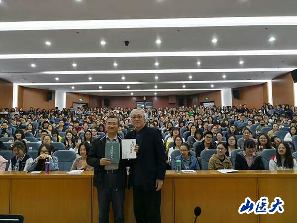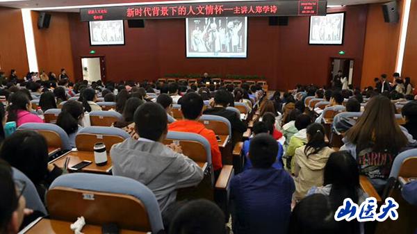 4月15日上午,第八届“健康人文月”在中都校区图书馆一层报告厅拉开帷幕。本届“健康人文月”的主题是“敬畏生命 尊重生命 关爱生命”,为突出活动主题,首场讲座即“健康人文论坛第九十三讲”,特别邀请了年过八旬的美学专家郑学诗先生担任开讲嘉宾,以“新时代背景下的人文情怀”为题,讲述人文情怀中的爱与美。此次讲座同学们期待已久,可容纳200人的报告厅座无虚席。本次讲座由人文社会科学学院院长王志中教授主持,讲座开始前郑学诗先生向健康人文研究中心赠送了他的两本专著,并与现场同学合影留念。