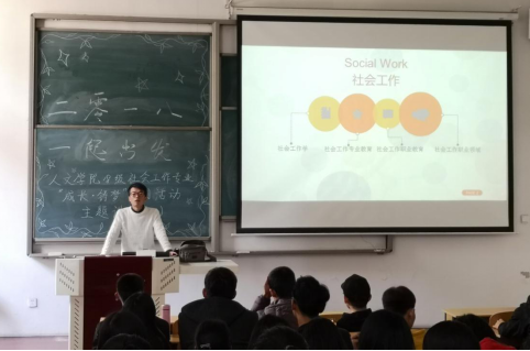 2018年11月9日下午14:00,人文学院2018级社会工作专业“成长·助梦”系列活动主题讲座在慎思楼B座103举行。讲座由张猛老师主持,并邀请毕业于日本东京福祉大学的齐少杰博士向社会工作专业2018级全体同学做了以“Start from Social Work”为主题的讲座。