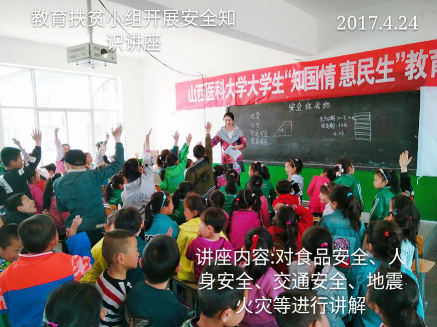 4月18日,由人事处、人文社会科学学院、马克思主义学院共同组织,王志中、刘晓丽、姚尚满、贾冰云为指导老师,由社会工作专业本科生和公卫学院研究生等12名同学组成了大学生“知国情,惠民生”教育实践服务队,在国家级贫困县吕梁市兴县康宁镇康宁村开展为期十天的教育扶贫活动。