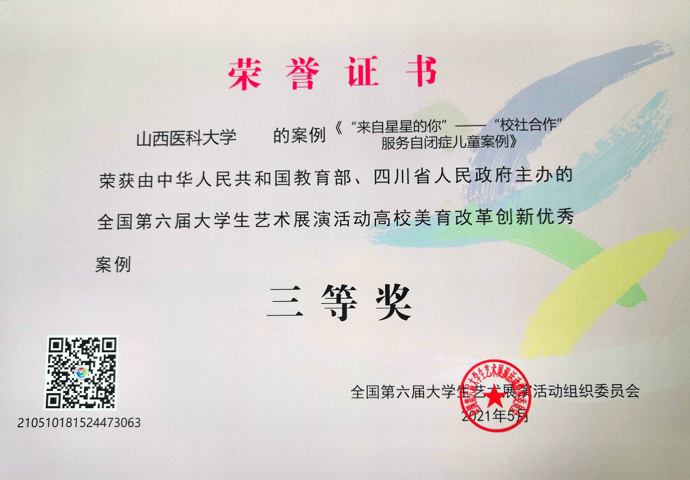 2021年5月,万象城体育awcsport《“来自星星的你”——“校社合作”服务自闭症儿童案例》,获教育部、四川省政府主办的全国第六届大学生艺术展演活动高校美育改革创新优秀案例三等奖 。