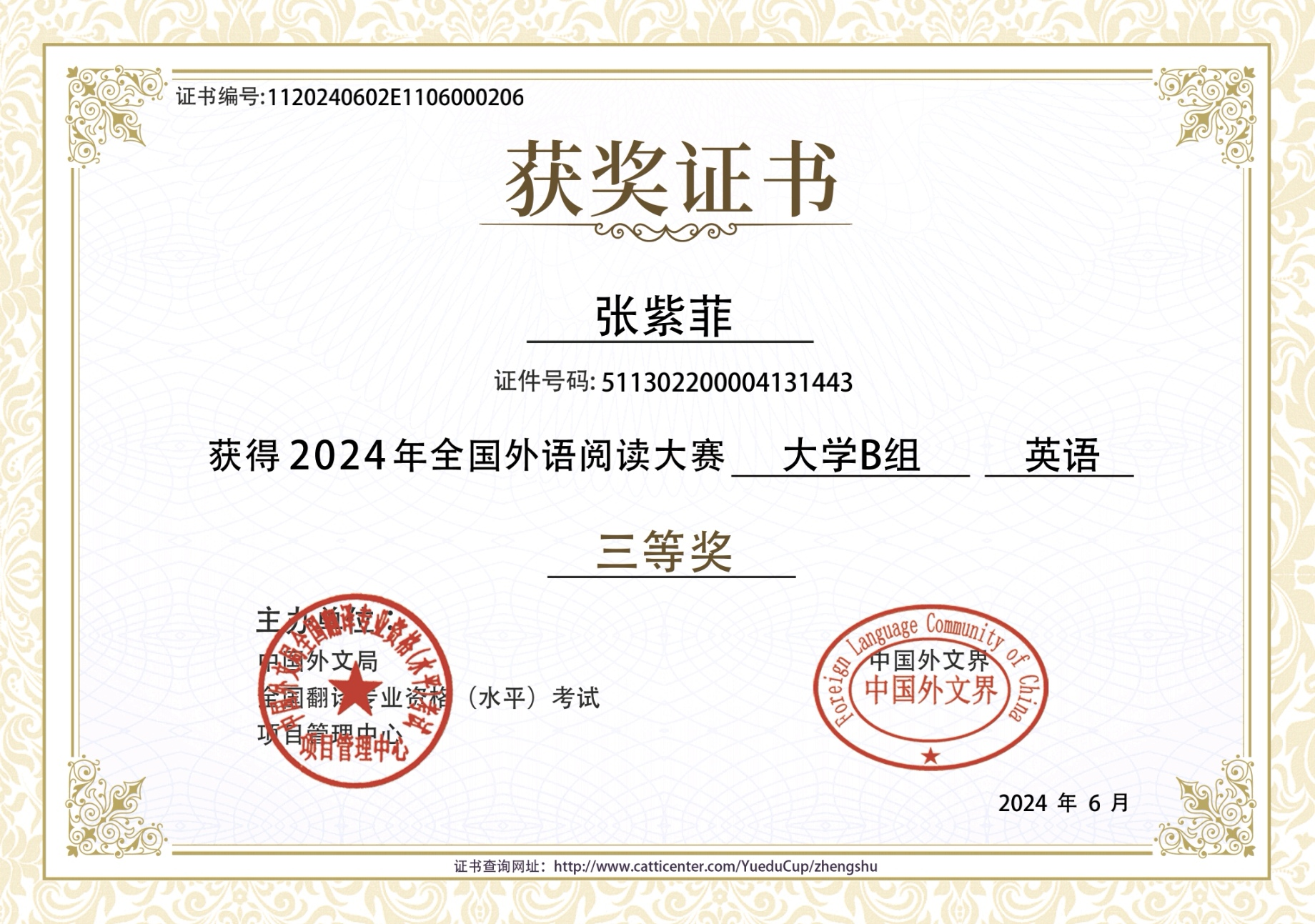 2024年6月,张紫菲获全国外语阅读大赛大学B组英语三等奖。