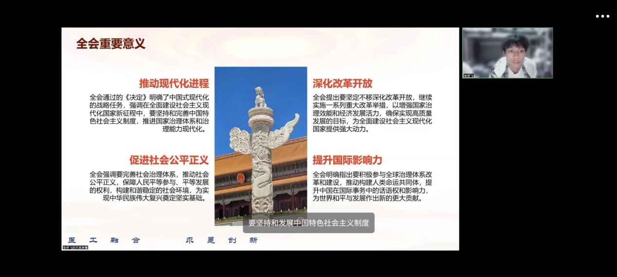 10月21日,万象城体育awcsport生物医学工程系组织全体学生团员开展线上主题团课。本次团课创新采用“青马学员领学”模式,由校级“青马工程”学员张桥飞同学担任主讲,深度解读党的二十届三中全会精神,聚焦全会“推动现代化进程、深化改革开放、促进社会公平正义、提升国际影响力”四大战略意义。