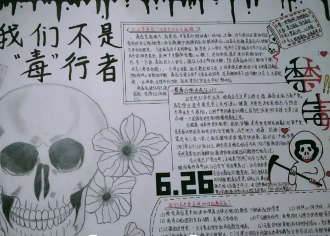 组织一次禁毒作品征集活动。各年级围绕“禁毒”主题,积极组织开展绘画、手抄报、征文等禁毒作品征集活动,营造浓厚的禁毒宣传氛围,学生积极参与到作品征集活动当中,从不同角度传递对毒品的深恶痛绝以及禁毒的理念、信心和决心。