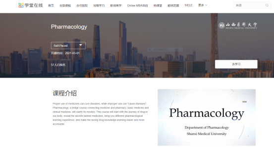 Recently, the English version of Pharmacology has been successfully released in"Xuetang Online", the online teaching international platform authorized by the Ministry of Education. It is the first international MOOCS course of our university and open free to the learners all over the world. Pharmacology, managed by professor Yan Wang from the Department of Basic Medicine, is supported by the Quality Course Construction Project of Shanxi Medical University in 2020. Pharmacology studies the interaction between medicines and the body, the mechanism of drug action, and provides basic data and scientific supportsfor the rational use of medicines in clinical disciplines. It is a bridge course connecting basic medicine and clinical medicine. In the process of curriculum design, the teaching team re-build the professional knowledge according to their long-term education experience and the examination syllabus. The team also provides the corresponding curriculum resources, such as course introduction, presentation, chapter assignment and other basic teaching activities resources. All of these guarantee the learning efficiency. In the follow-up, the teaching team will continue to improve the course quality and expand the coverage.