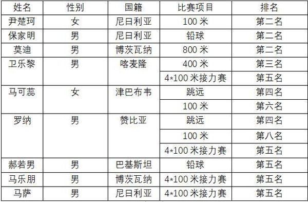 国际教育学院有18名学生报名参加7个田径项目的竞赛。他们努力拼搏、奋勇争先,为学院取得团体总分第七名的历史最好成绩,展现出国际学生积极进取的青春风采。