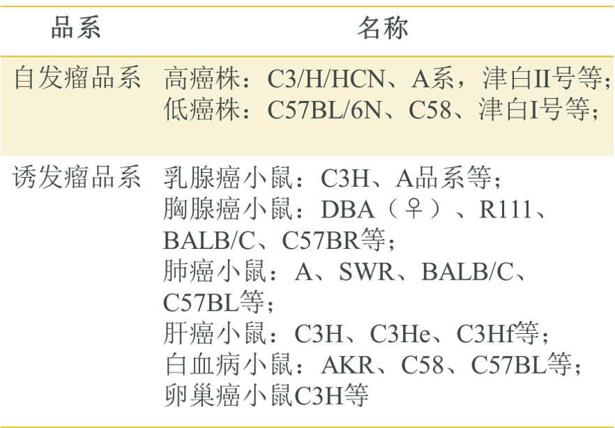 (2)以肿瘤研究需要培育的品系很多,如下表: