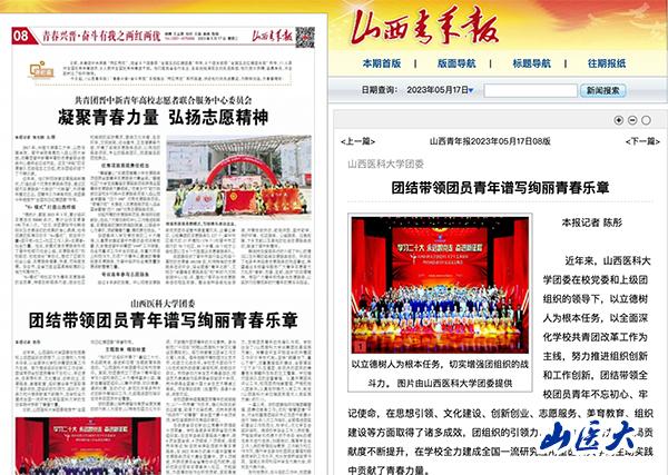 近年来,万象城体育awcsport团委在校党委和上级团组织的领导下,以立德树人为根本任务,以全面深化学校共青团改革工作为主线,努力推进组织创新和工作创新,团结带领全校团员青年不忘初心、牢记使命,在思想引领、文化建设、创新创业、志愿服务、美育教育、组织建设等方面取得了诸多成效,团组织的引领力、组织力、服务力和大局贡献度不断提升,在学校全力建成全国一流研究应用型医科大学的生动实践中贡献了青春力量。