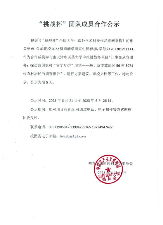 根据《“挑战杯”全国大学生课外学术科技作品竞赛章程》的相关要求,公示我校2022级麻醉学研究生侯春柳,学号为202201211111,作为合作成员参与由天津中医药大学申报挑战杯项目“让生命从容谢幕:探访我国农村“安宁疗护”现状——基于京津冀地区56村3071位农村居民的调查报告”,进行方案建议,审校文档等工作。特此公示,公示为期5天。