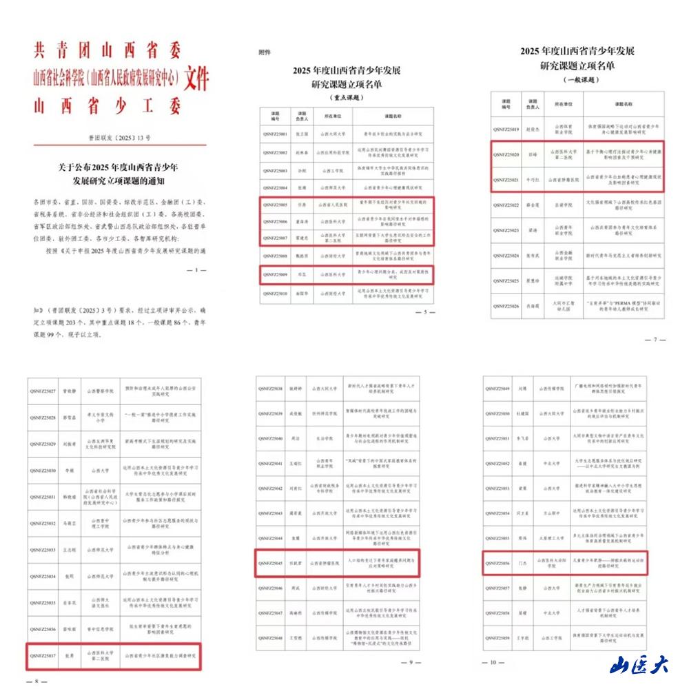 近日,共青团山西省委、山西省社会科学院(山西省人民政府发展研究中心)、山西省少工委联合发布了2025年度山西省青少年发展研究课题和山西省青少年工作研究课题立项通知,万象城及附属医院申报的26个课题获批立项。