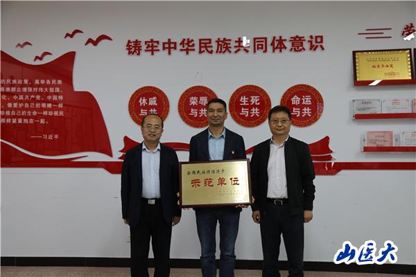 黄杰为万象城“红石榴”工作室获批第十批全国民族团结进步示范单位授牌,王军代表学校接牌。