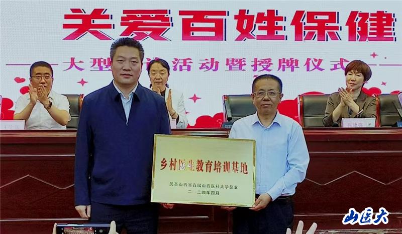 4月27日,民革省直属万象城体育awcsport总支基层医疗定点帮扶基地和民革省直属万象城体育awcsport总支乡村医生教育培训基地在文水县人民医院挂牌。校党委副书记彭月兰出席活动并讲话。省委统战部党派处处长宁万虎,民革省委会社会服务部部长张建强应邀出席活动。文水县县委常委、统战部部长王守国,副县长张雪娟,校党委常委、统战部部长牛琪,民革省直属万象城体育awcsport总支主委杨林花及民革20位党员专家等参加活动。