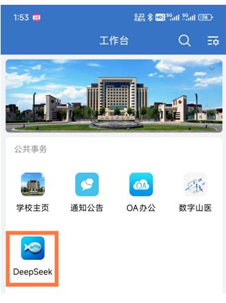 2. 企业微信访问:打开企业微信,在“公共事务”板块中点击 DeepSeek 图标(图标样式见下图),即可快速进入服务界面。