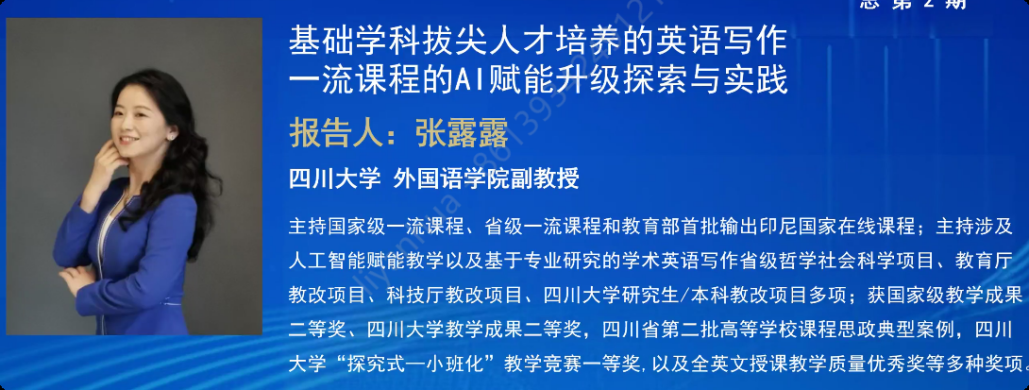 团队着重学习了四川大学外国语学院张露露副教授做的第三场报告,报告题目为“基础学科拔尖人才培养的英语写作一流课程的AI能升级探索与实践“。为了激发和深化学生在英文写作中的批判性思维,研究者尝试将AI技术应用于英语写作教学,开展以跨学科融合为核心的教改尝试。