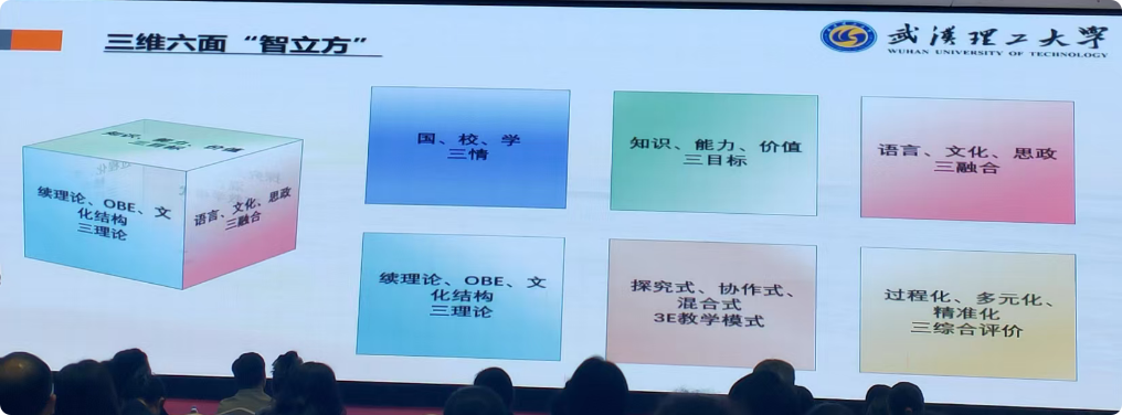 湖北理工学院张健教授就英语专业的新文科教学改革实践做了报告,武汉理工大学周静教授介绍了“人文为本,数智添翼--建构大学英语教学的三维六面智立方”的创新教学模式及突出成果。湖北航空学院肖惜教授阐述了AI外语教学法的构建,围绕信息时代网络技术的普及和应用,详细阐述了现代教育与外语教学革命、多媒体辅助教学的方法及意义。