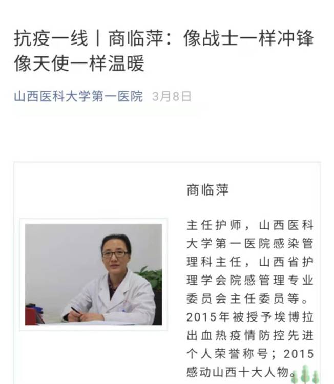 在她带领下,先后共6名导师、11名在读研究生、百余名毕业生及近百名本科毕业生驰援湖北奋战在抗疫一线。院感专家商临萍带队辗转省内疫情最凶险的地方指导抗疫;临床护理专家郭锦丽专业统筹,保证一线抗疫力量,守护山西,取得“双零”战绩。后方师生或投身当地防疫志愿服务中,筑牢后防线;或以笔为援,以艺战疫,汇聚精神力量。同时以理论促实践,团队边实战边总结,发表抗疫相关学术论文3篇,申报省级课题1项,为全国抗疫提供借鉴参考,贡献“山西护理力量”!