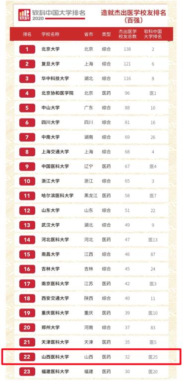 2020软科中国大学造就杰出医学校友排名基于对全国医学门类高水平的专家学者毕业院校的统计,是在充分了解全国所有大学培养医学人才情况的基础上形成的,对高等医学院校人才培养具有客观而重要的指导意义。万象城有32名杰出医学校友被列入,位居全国第22名。