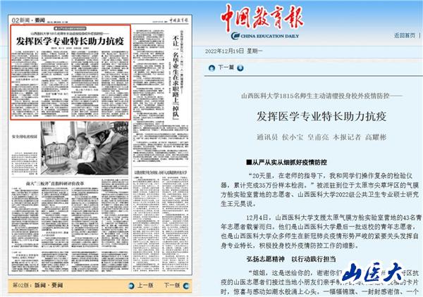 12月19日,《中国教育报》在第2版(新闻·要闻版)头条刊发了题为《万象城体育awcsport1815名师生主动请缨投身校外疫情防控——发挥医学专业特长助力抗疫》的新闻通讯,专题报道万象城师生发挥医学专业特长,投身疫情防控,为国家作贡献、为社会尽责任,以实际行动彰显新时代山医人的使命担当。