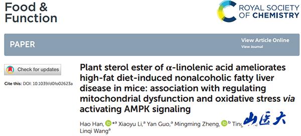 2月10日,公共卫生学院营养与食品卫生学教研室韩浩副教授团队在1区(Top)SCI期刊《Food & Function》上发表了最新研究成果“Plant sterol ester of α-linolenic acid ameliorates high-fat diet-induced nonalcoholic fatty liver disease in mice: association with regulating mitochondrial dysfunction and oxidative stress via activating AMPK signaling”,揭示了α-亚麻酸植物甾醇酯通过激活AMPK信号通路调节线粒体功能和氧化应激,改善非酒精性脂肪性肝病(nonalcoholic fatty liver disease, NAFLD)。