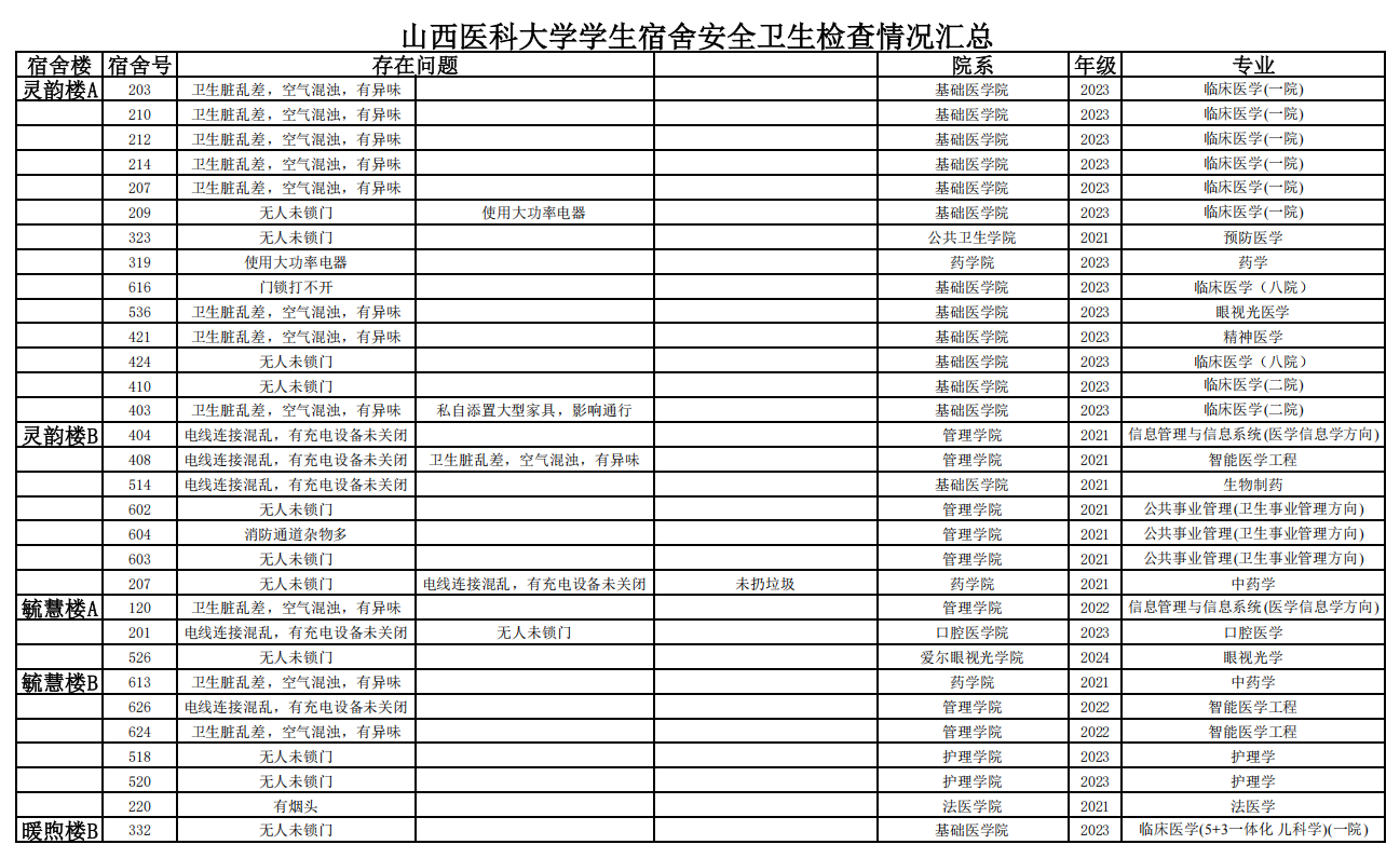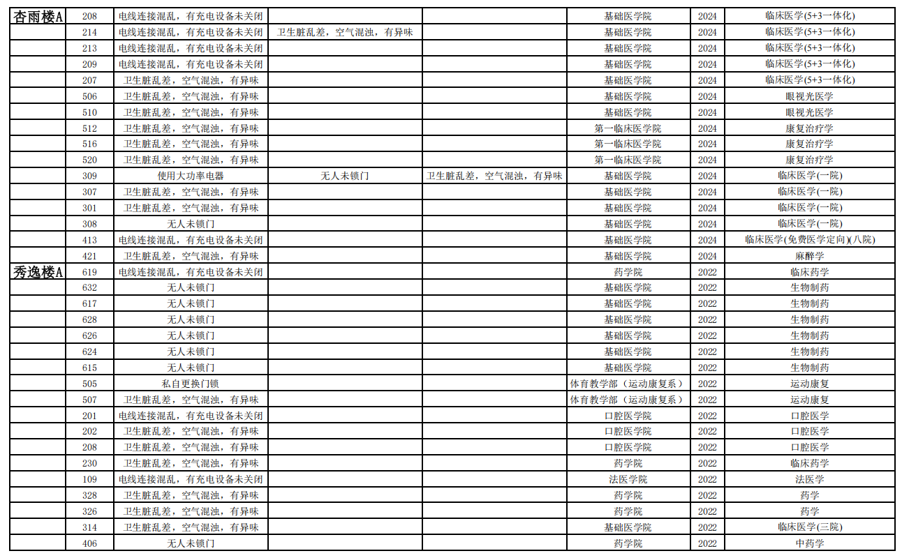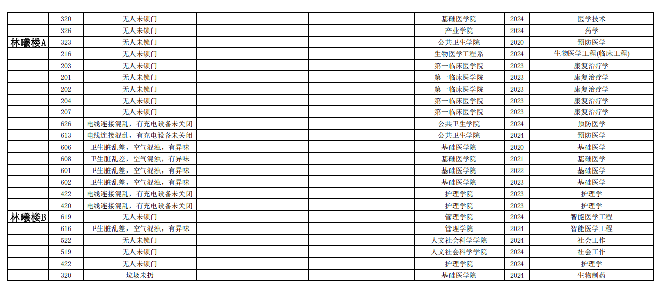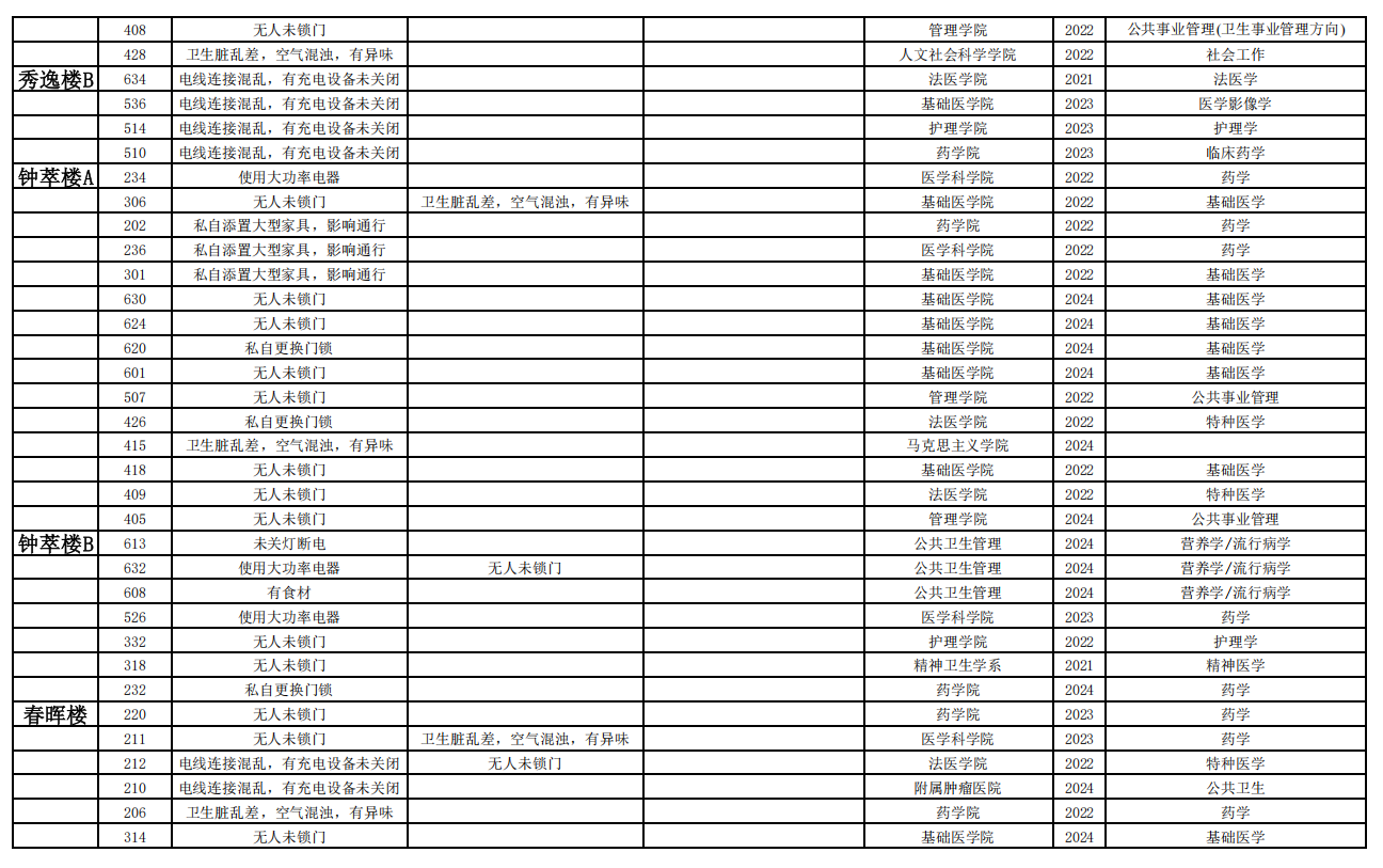 2025年3月12日下午,由学生工作部联合研究生学院党委、保卫部、后勤保障部对中都校区学生宿舍进行了安全卫生大检查。针对此次检查中存在的问题,各学院(系、部)需予以高度重视,并组织辅导员深入宿舍,核查情况,及时整改,以消除安全隐患。具体检查情况汇总如下:
