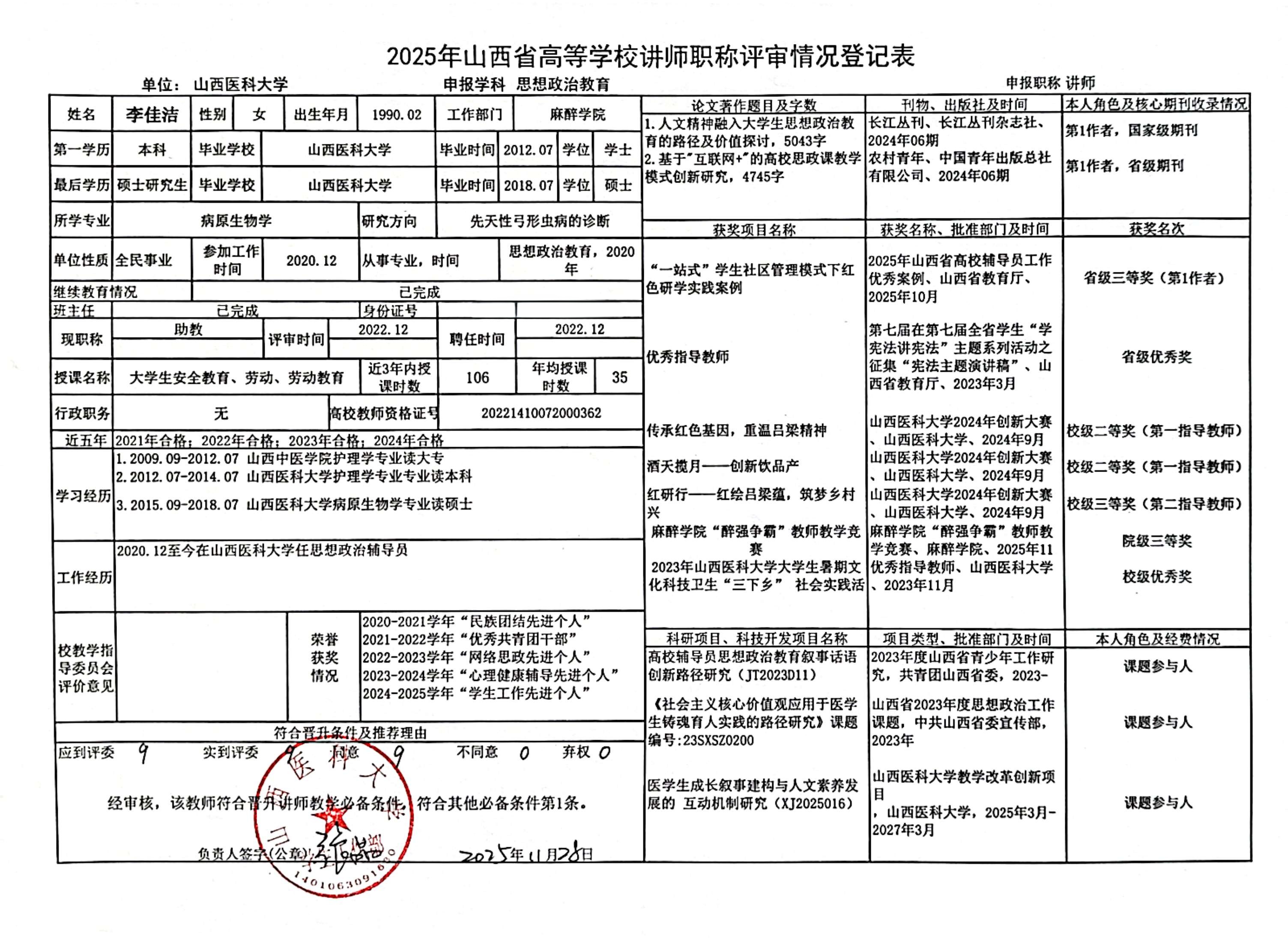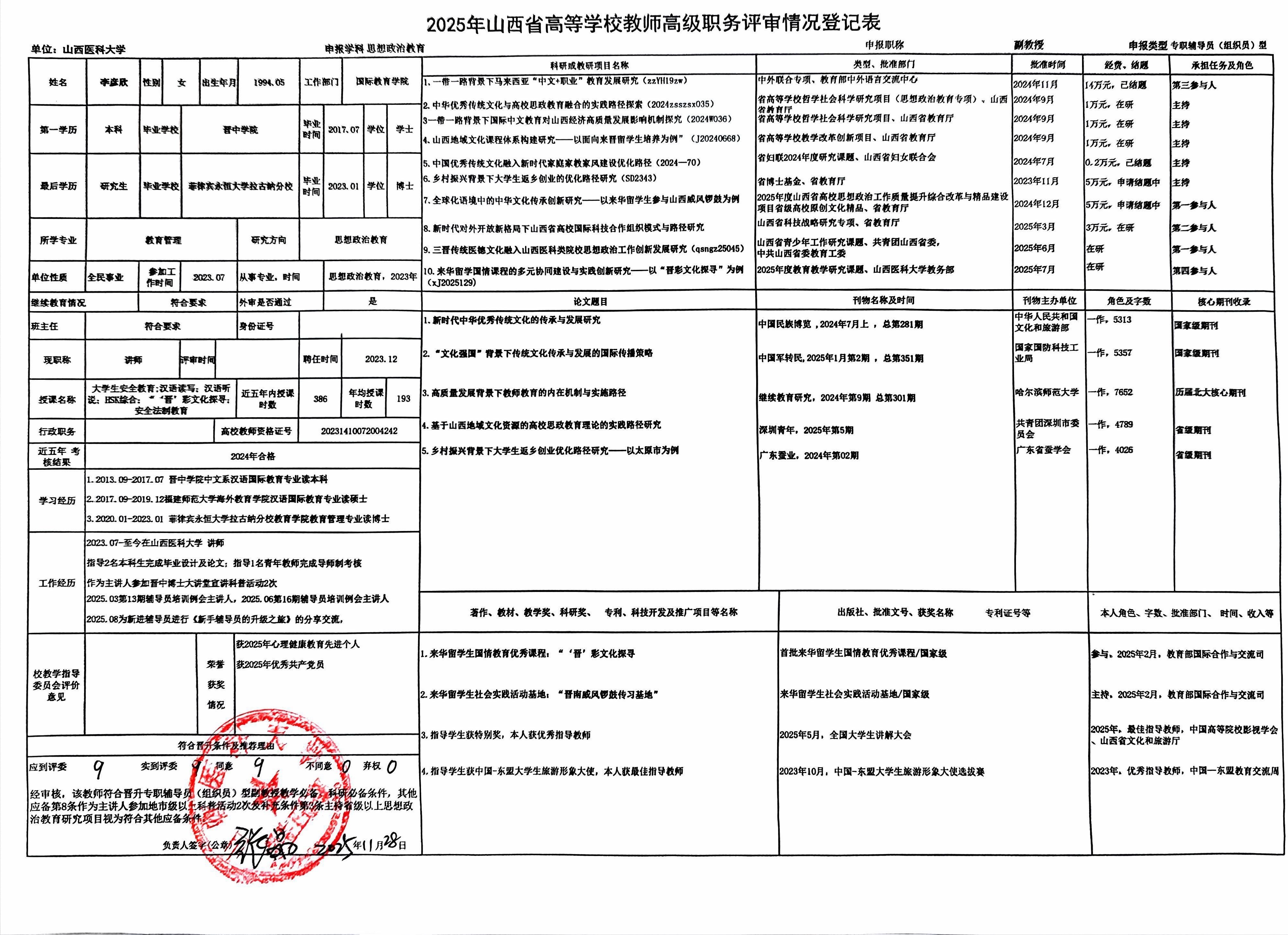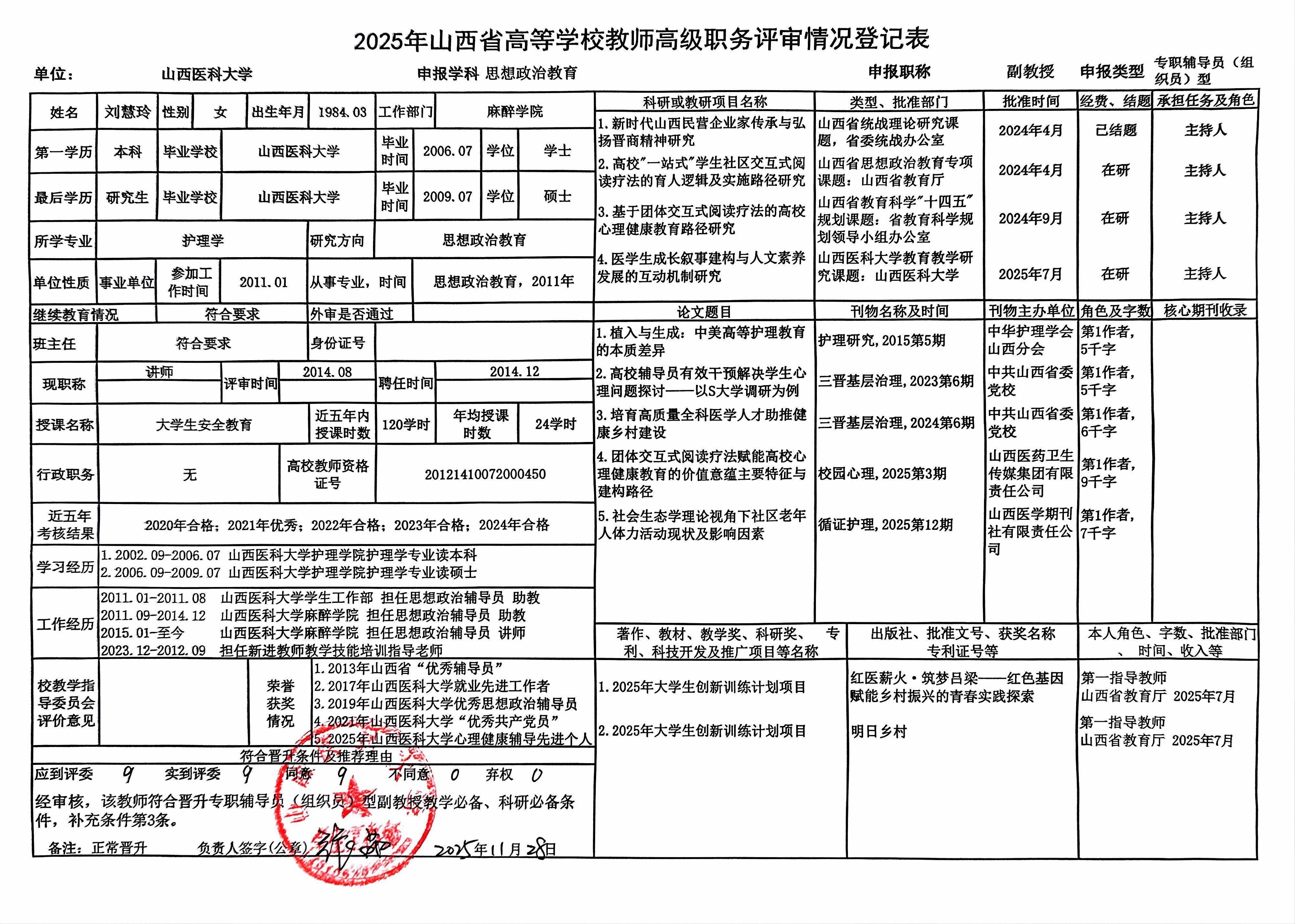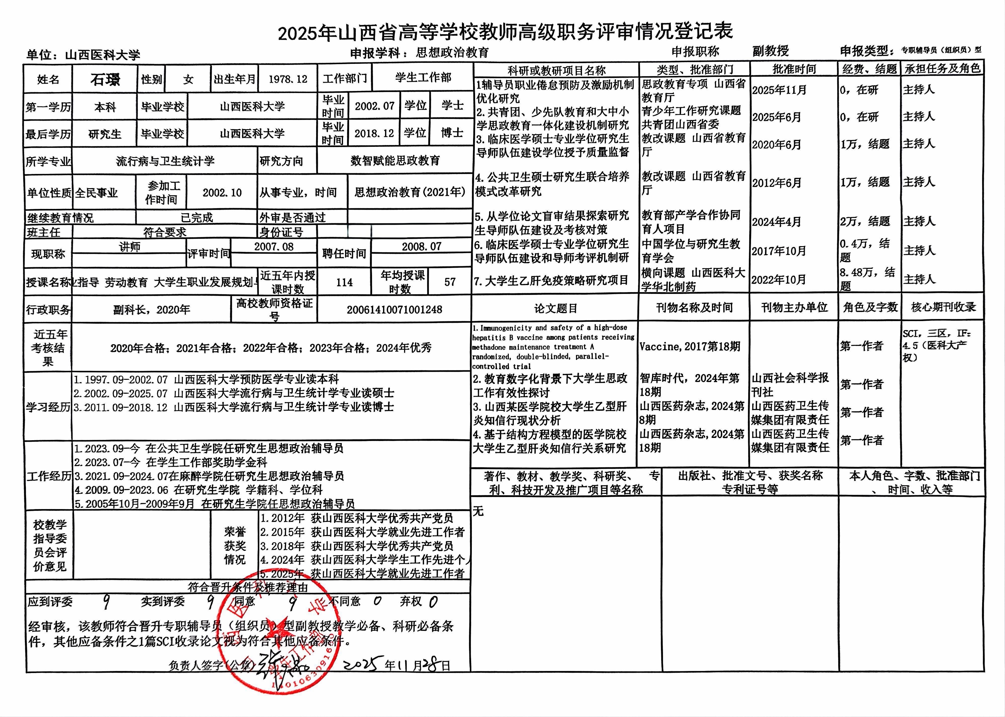 根据《山西省人力资源和社会保障厅关于印发<职称评审管理实施细则>的通知》(晋人社厅发〔2021〕28 号)、《关于做好2025 年度全省职称评审工作的通知》(晋人社厅函〔2025〕560号)、《关于开展 2025 年度全省高等学校教师高级职称评审工作的通知》(晋教师函〔2025〕52 号)、《关于开展 2025 年度全省实验系列高级职称评审工作的通知》(晋教师函〔2025〕28 号)、《万象城体育awcsport职称评审和聘任管理办法(试行)》(山医大党〔2024〕59 号)精神,经专职辅导员(组织员)型教师职称评审组评审,石璟等13人符合申报条件,同意推荐以下人员申报相应职称,现将符合条件人员情况予以公示(详见附表),公示时间为11月28日-12月5日,公示期为五个工作日。