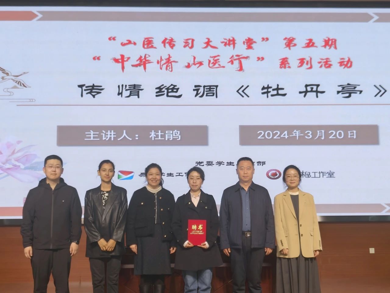 为弘扬中华优秀传统文化,促进学生文化素质的提升,3月20日晚,学生工作部易班学生工作站和红石榴工作室在中都校区教学办公楼一层学术报告厅,共同举办了第五期“山医传习大讲堂”及“中华情·山医行”系列活动,主题为“传情绝调《牡丹亭》”。讲座由中北大学人文社会科学学院副院长杜鹃教授主讲,学生工作部部长张晶、副部长杨洁出席,易班学生工作站和红石榴工作室全体成员、热爱中华传统文化的同学们参加了此次讲座,网络思政教育中心负责人王玉男主持。