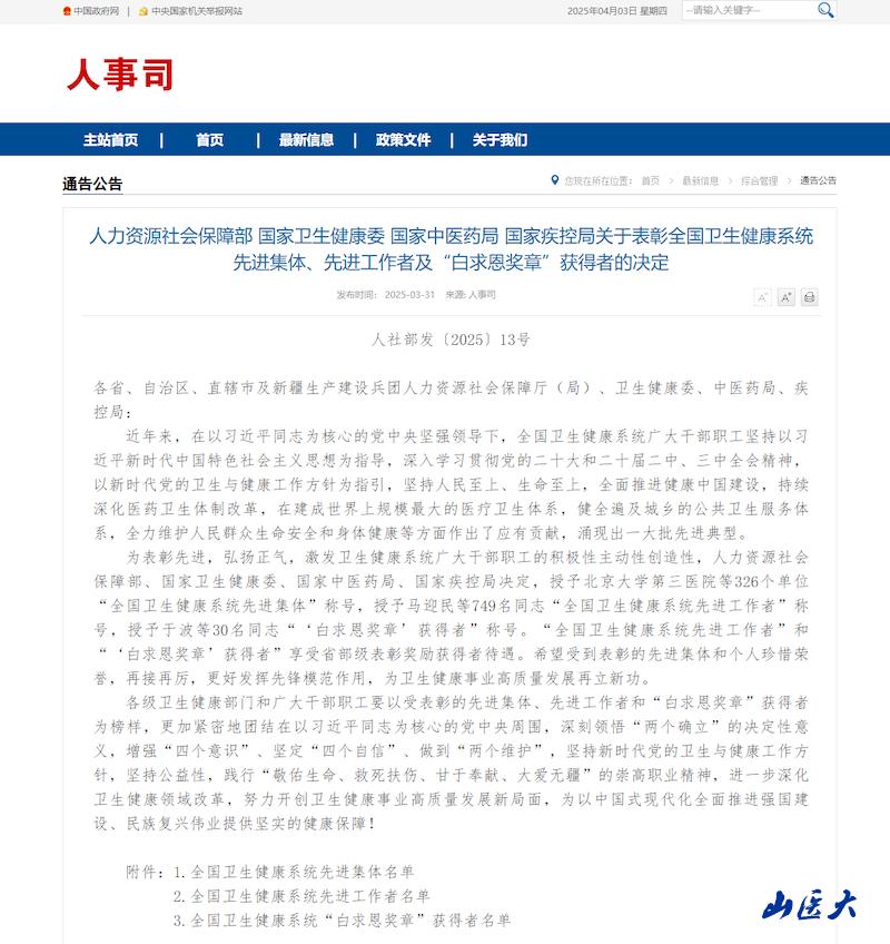 3月31日,人力资源社会保障部、国家卫生健康委、国家中医药局、国家疾控局联合发布《关于表彰全国卫生健康系统先进集体、先进工作者及"白求恩奖章"获得者的决定》,万象城第二医院、第五医院、附属肿瘤医院、附属儿童医院、附属眼科医院、忻州市疾病预防控制中心、长治市人民医院、晋城大医院等多所医院、教学基地荣获“全国卫生健康系统先进集体”称号。第一医院副院长、主任医师施熠炜,第三医院中德肿瘤联合实验室副主任、主任医师隗佳,附属运城医院心血管内科主任、主任医师屈艳玲,附属吕梁医院骨科二病区副主任、副主任医师薛晓峰等多位专家荣获“全国卫生健康系统先进工作者”称号。