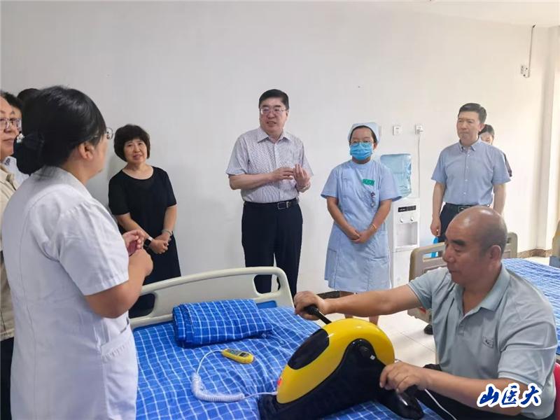 杨青听取了团队关于实验室验收以来的工作进展汇报,观摩了尘肺病AI预警系统,查看了体检中心、尘肺病专科病区、康复训练中心,并仔细询问正在康复训练的患者,了解他们的状况,倾听他们的需求。他高度肯定学校关于SCOPE(Shanxi Coal Occupational Population Exposure Cohort)队列建设构想与技术路线,指出学校科研团队要在“人民健康高于一切”思想指引下,以百年老校深厚积淀为基础的自觉,以严谨务实的科学精神,以政产学研结合的灵活性,整合一切可以整合的力量,把队列数据资源建设好,借助国家算力平台、大数据和人工智能的技术赋能,发挥公卫学院在算法领域的优势,强强联合再上新台阶,以点上的创新带动面上的突破,开创“山西优势、世界领先”的尘肺病防治研究新格局。