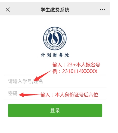 考生通过微信公众平台自助缴纳报名费:1.搜索微信公众号“万象城体育awcsport计划财务处”或扫描下方二维码;2.点击菜单,业务办理→学生缴费,在学号处输入年份+考生本人的报名号(例:2310114*****),初始密码为身份证号后六位,登录自助缴费系统(见图例);3.点击“我要缴费”,选择缴费年度(2023),确认缴费信息,通过银联在线进行支付(任何有银联标志储蓄卡均可)。
