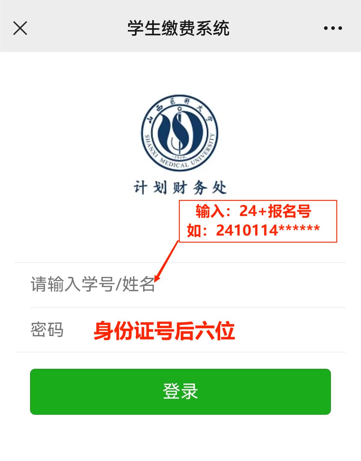考生通过微信公众平台自助缴纳报名费:1.搜索微信公众号“万象城体育awcsport计划财务部”或扫描下方二维码;2.点击菜单,业务办理→学生缴费,在学号处输入24+考生本人的报名号(例:2410114*****),初始密码为身份证号后六位,登录自助缴费系统(见图例);3.点击“我要缴费”,选择缴费年度(2024),确认缴费信息,通过银联在线进行支付(任何有银联标志储蓄卡均可)。