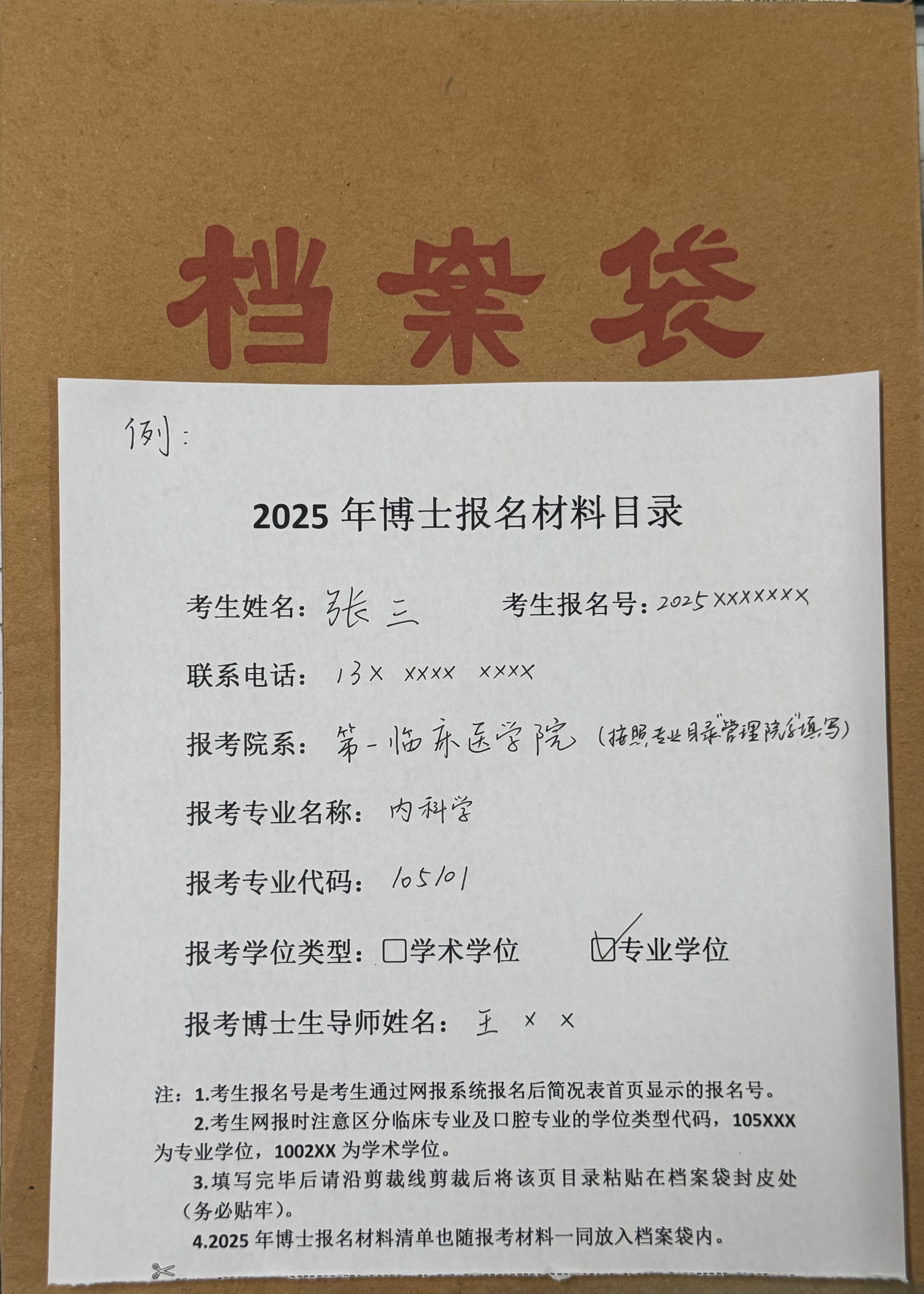 考生完成网上报名并确定报名志愿后,按照清单列表将个人报考材料统一装入自备的档案袋内(见图例1、2)。