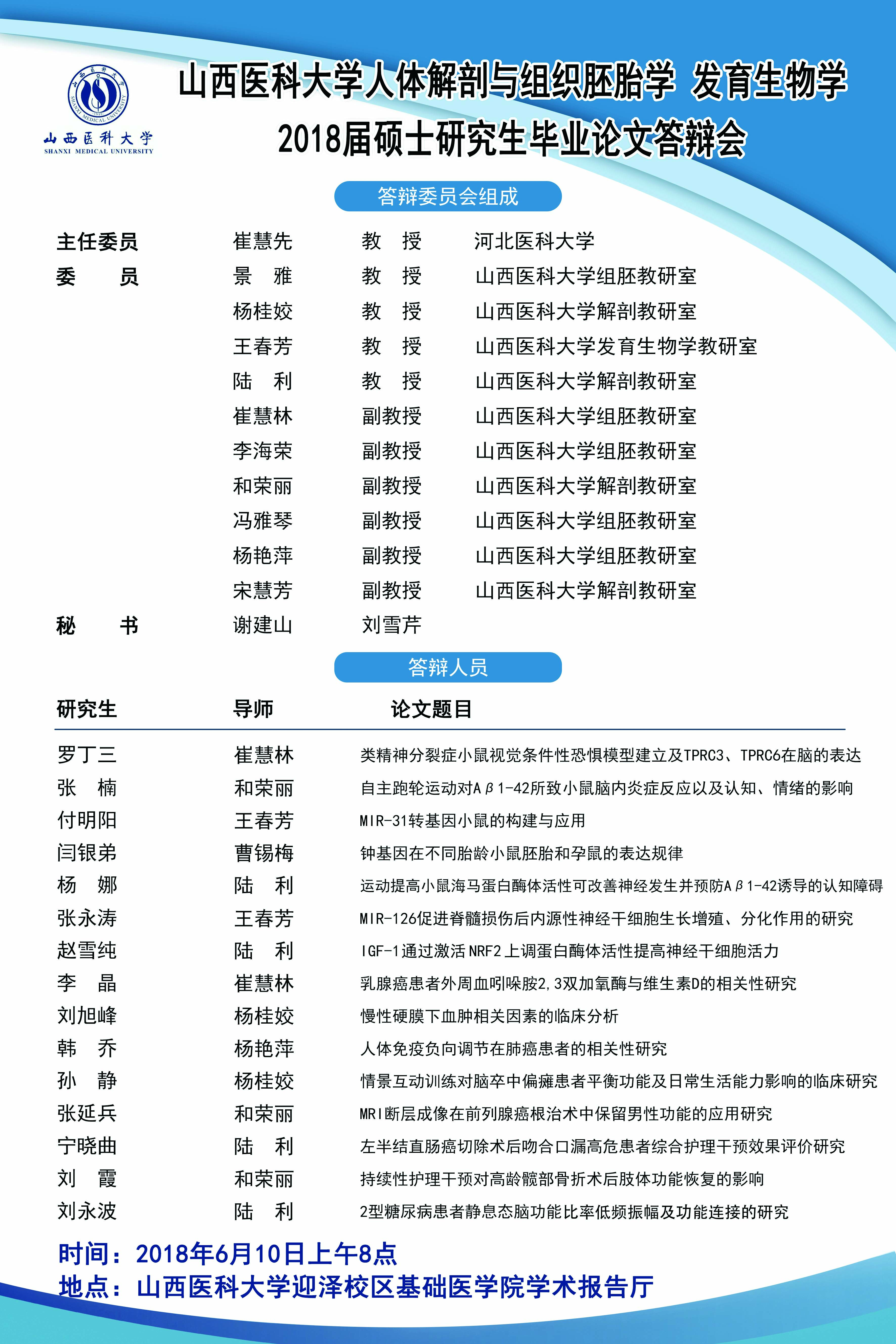 2018年万象城体育awcsport基础医学院人体解剖与组织胚胎学 发育生物学硕士研究生学位论文答辩会通知